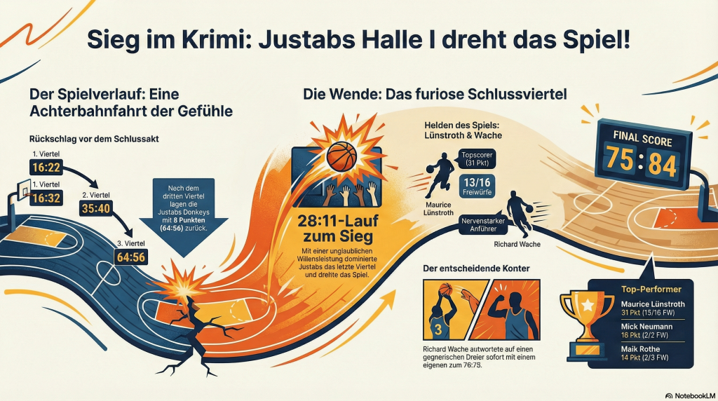 Was für eine Willensleistung! Unsere Jungs haben das Ergebnis beim Auswärtsspiel am 17. Januar im Harz noch gedreht: Justabs Donkeys gewannen mit 75:84. Ein echter Krimi in der Bodelandhalle am 11. Spieltag.
